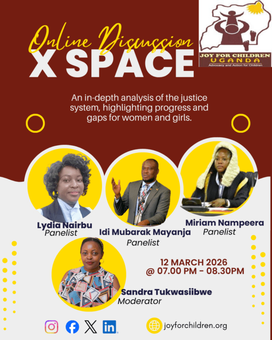In celebration of International Women’s Day, Joy for Children Uganda (JFCU) hosted an X Space discussion on March 12th, 2026, with the topic; Analyzing access to justice for women and girls in Uganda by highlighting the achievements and gaps. This conversation brought together gender experts, government officials and civil society advocates, who engaged in an extremely evidence-based and solutions-oriented conversation.