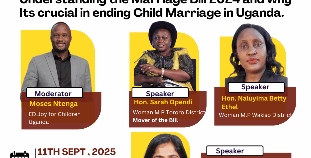 On August 11, 2025, Joy for Children Uganda (JFCU) hosted an X Space discussion on the Marriage Bill 2024. The conversation brought together Civil society advocates, Members of parliament, and international advocates to shed light on the bill’s significance, clarify common misconceptions, and explore its potential to end child marriage and strengthen family protections in Uganda. The event provided an important platform for dialogue, knowledge sharing, and collective advocacy, engaging Ugandans and global audiences in a timely conversation about one of the most pressing child protection issues in the country.